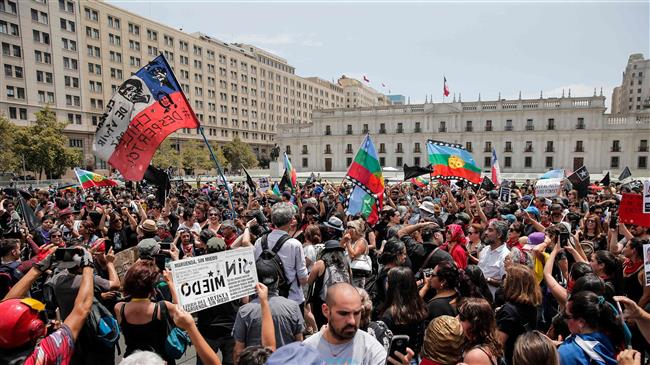 Hundreds of anti-government protesters have taken to the streets in the Chilean capital of Santiago against the alleged excessive use of force by police over the past three months of social unrest in the Latin American country.