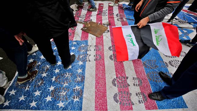 Protesters step on a makeshift US flag as supporters of Iraqi cleric Moqtada Sadr gather in the capital Baghdad for a "million-strong" march to demand an end to the presence of US forces in their country, on January 24, 2020. (Photo by AFP)
