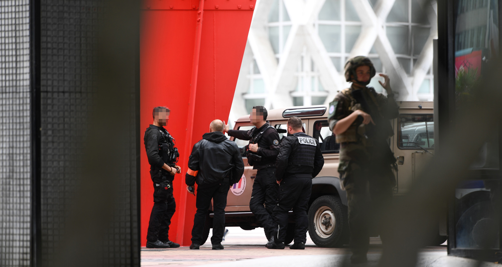 French policemen of the anti-terror Vigipirate talk next to a serviceman patrolling in the La Defense business district, west of Paris, France, on June 30, 2020, after police received a call reporting the presence of an armed man. (Photo by AFP)