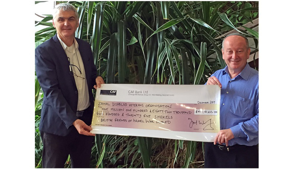 Frank Weinberg hands the cheque for more than one million Shekels to an IOF officer.