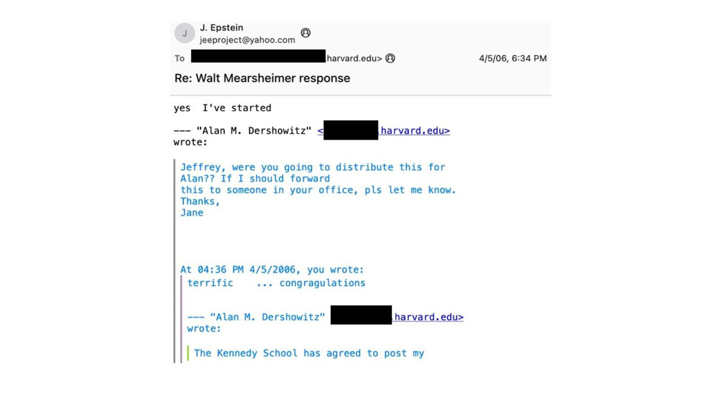 In early April 2006, Epstein received multiple early drafts of an article by Dershowitz titled “Debunking the Newest — and Oldest — Jewish Conspiracy.” In this piece, Dershowitz, who also served as Epstein’s lawyer, accused Mearsheimer and Walt of recycling “discredited trash” from neo-Nazi and so-called “Islamist” websites, alleging they authored a modern counterpart to the ‘Protocols of the Elders of Zionists’.