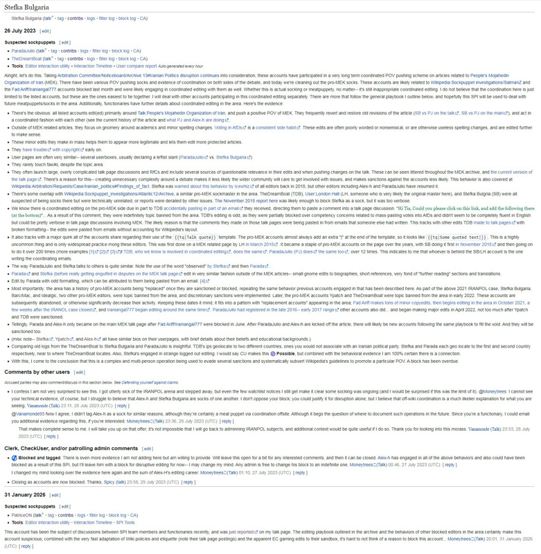 Wikipedia’s volunteer administrators have repeatedly documented this exact modus operandi across accounts such as Stefka Bulgaria, ParadaJulio, and TheDreamBoat – created between late 2016 and 2017 and eventually exposed and blocked in 2023.